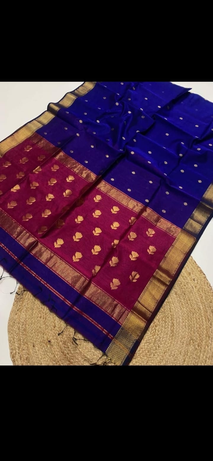 Royal blue with magenta pallu. Fit for the Rajwada palace.