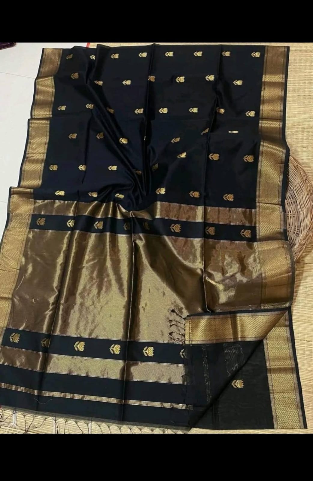 Midnight black with golden lotus buttis. Moonlight on the Narmada.